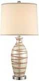 Universal Lighting and Decor , For a living room, bedroom or just about any other room, this table lamp will provide a soft and relaxed accent. The vase-shape ceramic base features an airy silver sea finish embellished with randomly placed thick copper stripes. Brushed steel stand and finial create a glistening punctuation for this fine light. A simple off-white drum shade offers a quiet accent on top. ...
