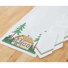Welcome to the Cabin Table, Perfect for your cabin, these coordinating linens are stamped for cross-stitch on white easy-care polyester/cotton fabric with a white perle edge. Includes complete instructions. Table runner is approximately 14 x 44" (36 x 112cm), napkins 16 x 16" (41 x 41cm). Made in U.S.A.Thread kit sold separately.